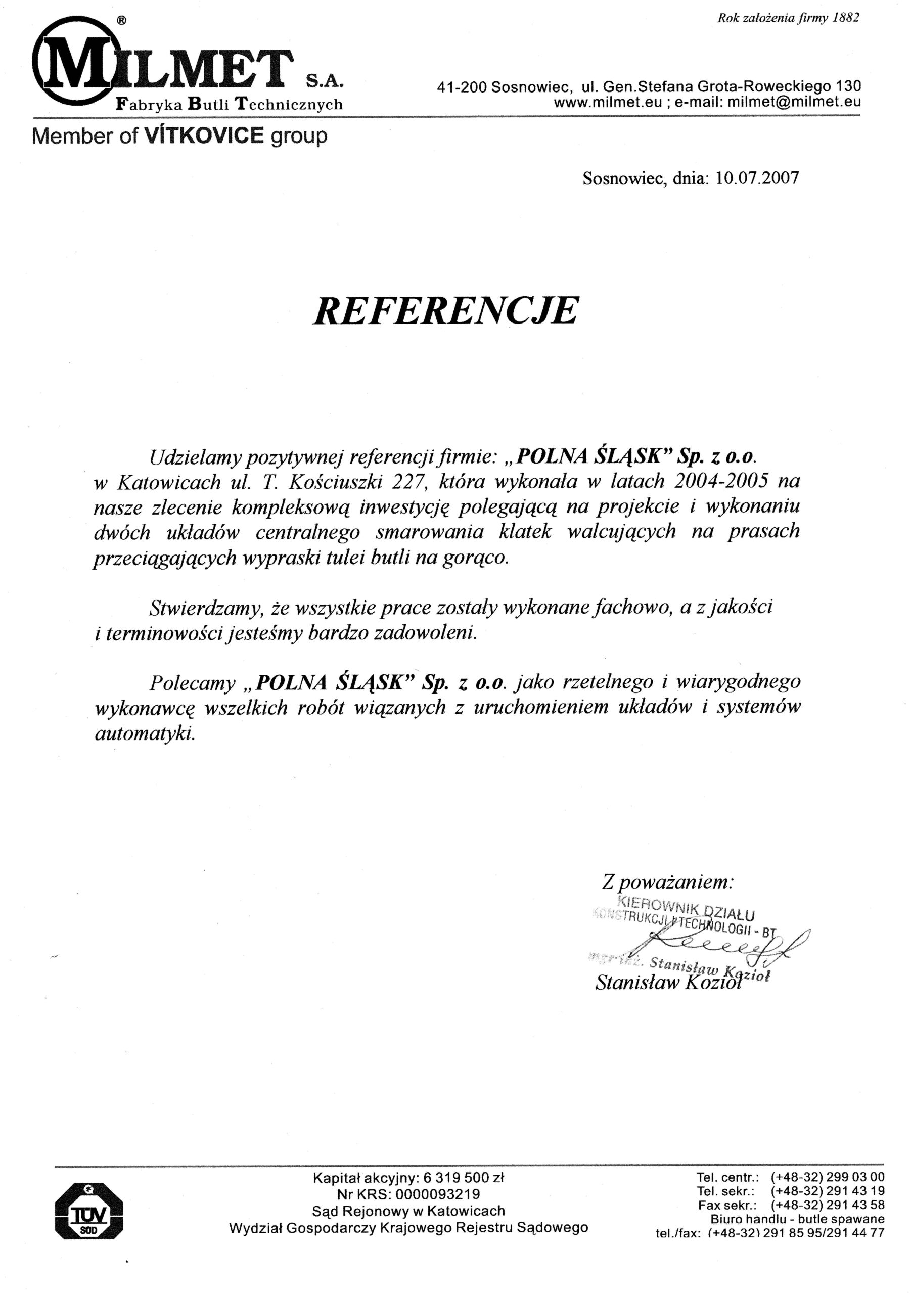 18Krosglass S.A.KrosnoUkład odbioru i przygotowania surowca do produkcji włókien szklanych Opomiarowanie 15 zbiorników, wykonanie szafy sterowniczejProjekt, dostawa, montaż uruchomienie