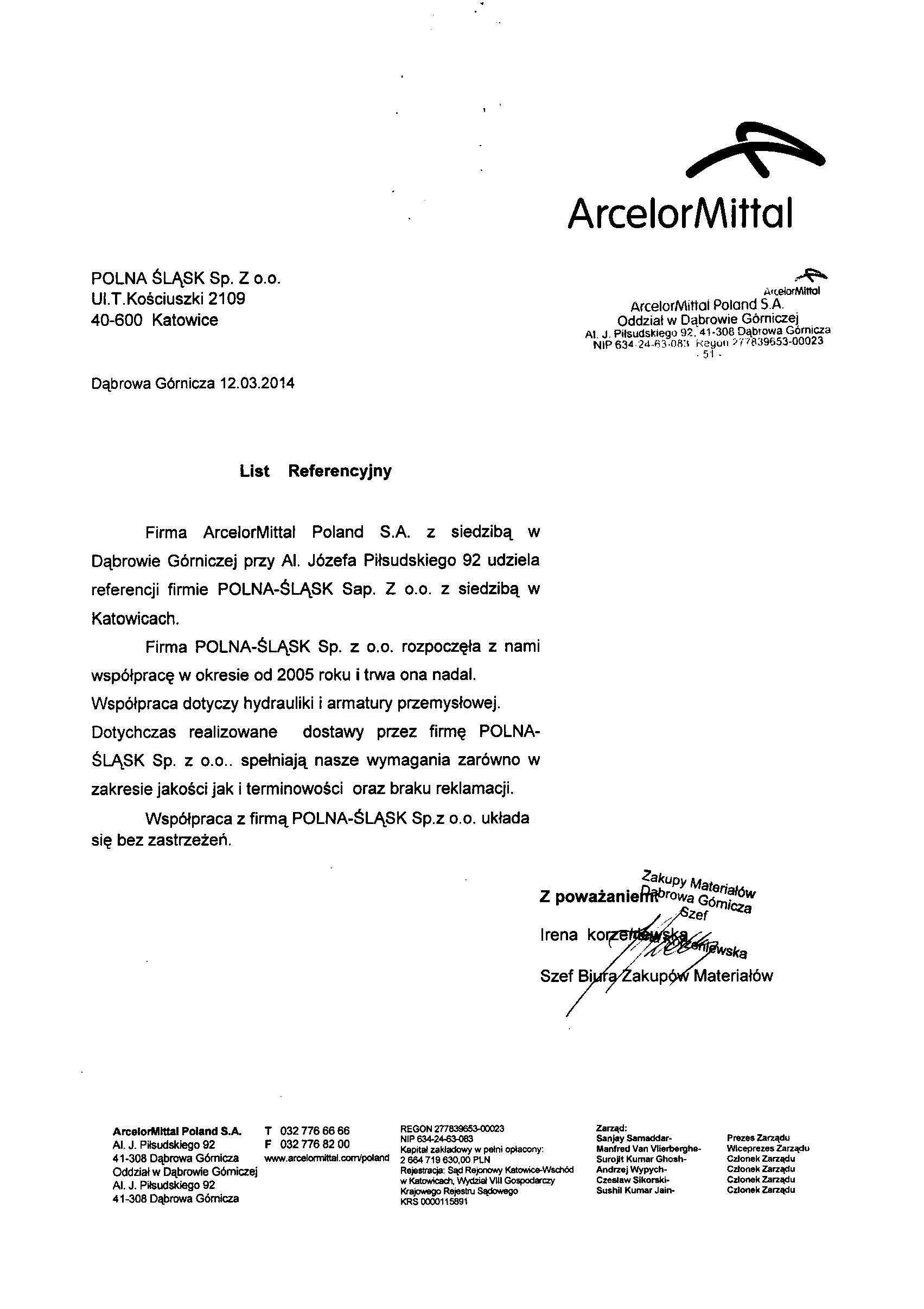 14ArcelorMittal Poland S.A.Dąbrowa GórniczaSukcesywna dostawa zaworów i urządzeń centralnego smarowania, układ smarowania łożysk w remoncieDostawa, + projekt, dostawa montaż uruchomienie