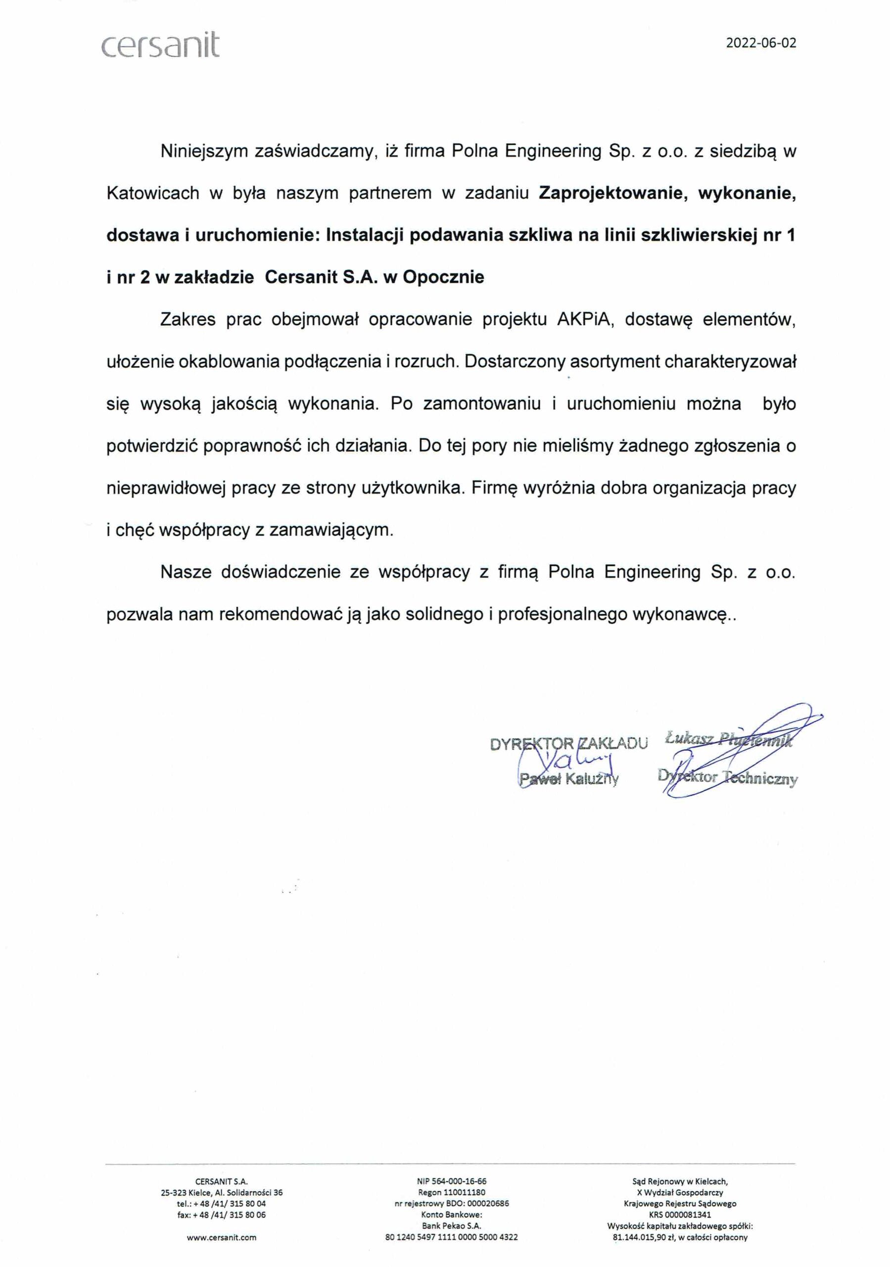 30Cersanit S.AOpocznoInstalacja podawania szkliwa na linii szkliwierskiej nr1 i nr2 w zakładzie OpocznoProjekt, dostawa, montaż uruchomienie