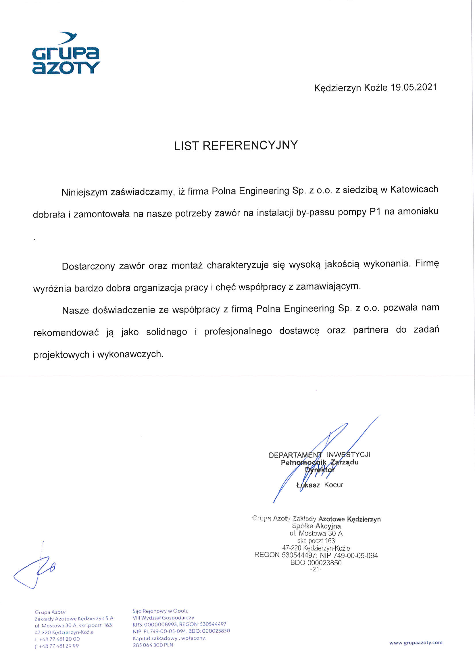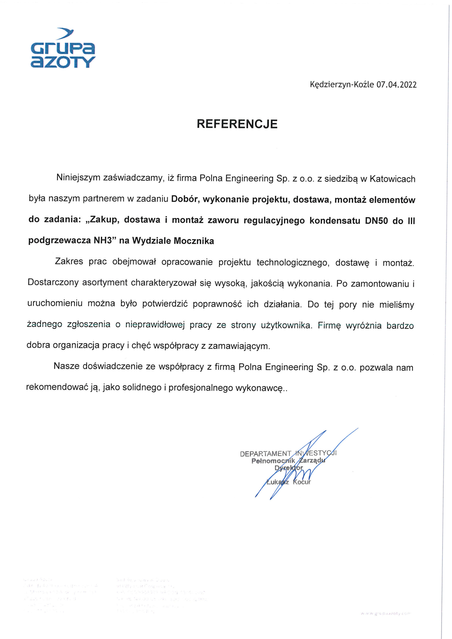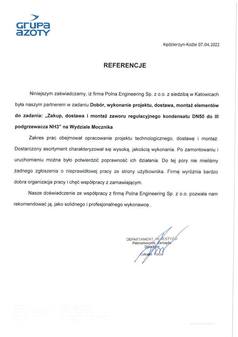 28Grupa Azoty ZAK KędzierzynKędzierzyn KoźleInstalacja zaworu regulacyjnego kondensatu DN50 do III podgrzewacza NH3 na wydziale Mocznika. Dostawa i montaż zaworu regulacyjnego bocznika pompy P1 na wydziale Mocznika Projekt, dostawa, montaż uruchomienie